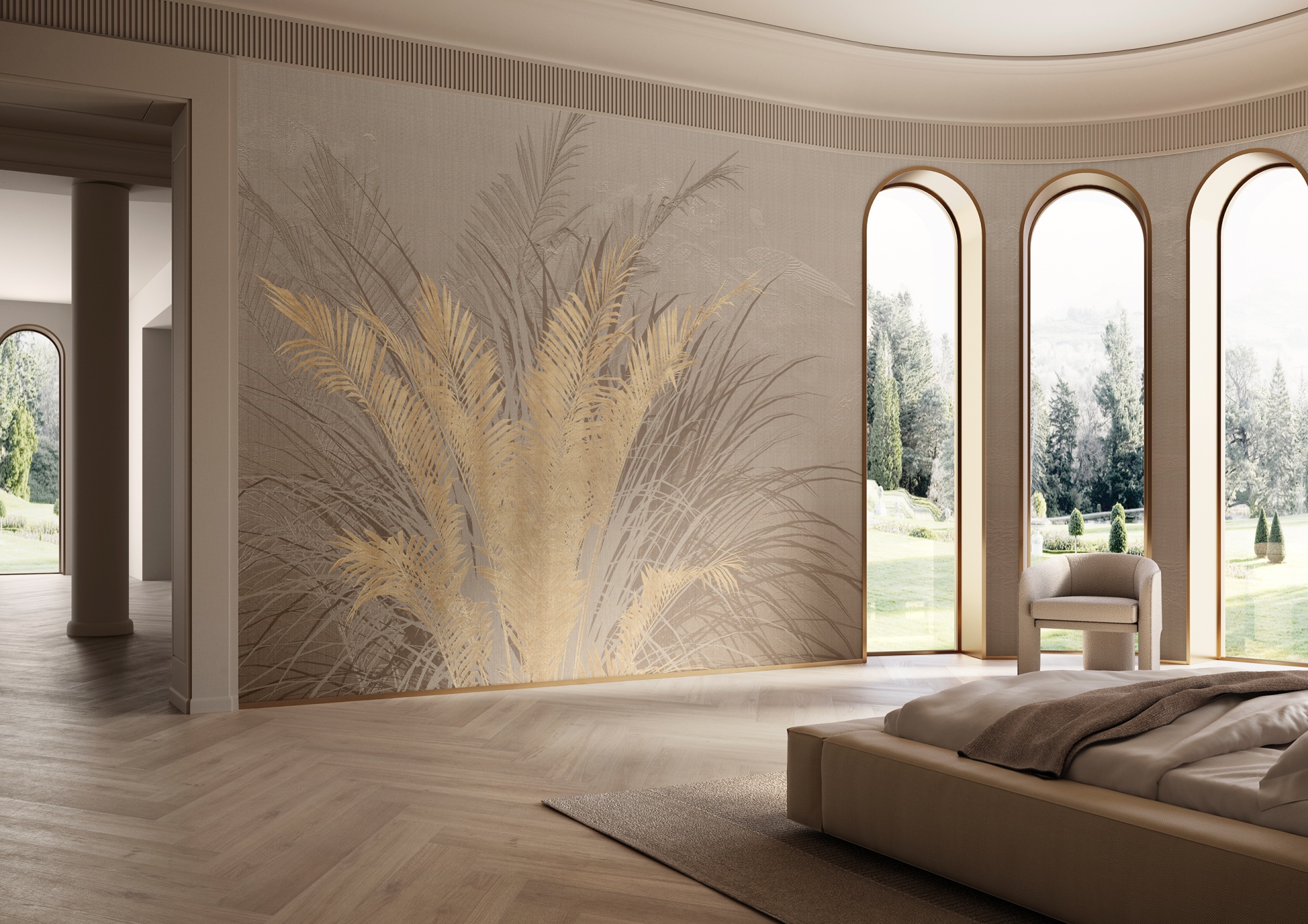 Tapeta GlamSatin je vyrobena ze speciálně vyvinutého materiálu, který zaujme svým nenápadným luxusem a leskem. Na neutrálním pozadí zemitých tónů ožívají botanické vzory v odstínech zlata, mosazi a platiny. Opulentní tropická zeleň, okvětní lístky a světlé rozkvetlé větve dodávají vnitřním prostorům jemnou a povzbuzující auru. Perleťový povrchivá úprava připomíná zářivý třpyt hedvábí. Speciální embosování odráží světlo, takže každý výtvarný prvek získává další vizuální rozměr.